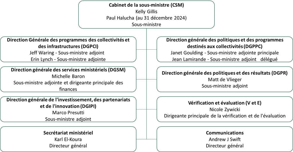 Dirigé par le sous-ministre du Logement, de l'Infrastructure et des Collectivités, le ministère est desservi par six sous-ministres adjoints, un sous-ministre adjoint délégué, un chef de la direction et trois directeurs généraux, qui relèvent du sous-ministre et travaillent dans neuf secteurs fonctionnels, comme il est indiqué ci-dessous.
